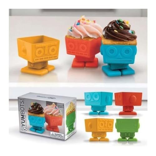 Fred & Friends Yumbotsare robot shaped cupcake molds. Each box contains 4 molds in four colors, red, blue, green and yellow. The actual mold itself is square. The robotic heads actually swivel. Each mold is actually differnet. Comes with baking instruction on a lovely printed gift box. Once again playing on our best selling robot theme